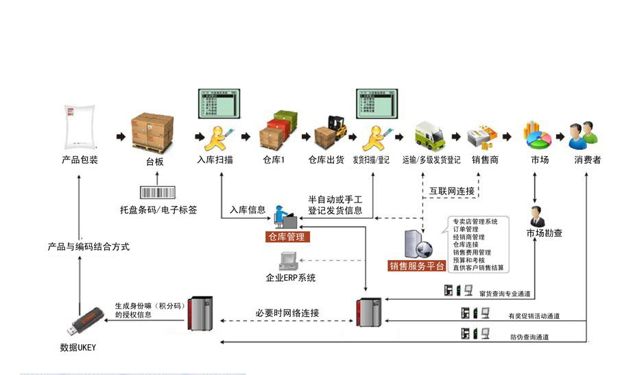 仓储环节:从生产(贴)到入库(可选择两套系统,扫描入仓和直接不扫描入仓。)直至市场查询(消费者、稽查人员等)等流通环节查询等功能上,善进产品防伪防窜解决方案都具有无法比拟的完整性和灵活性。除此之外,产品防伪防窜解决方案所具备的保证安全性的加密功能,功能的可扩性以及高效的运作成本,都显示出无比的优越性。善进“数字化流向监管系统”集成解决方案强大的防伪防窜全方位跟踪追溯效果,稳定的产品性能,专业的售后服务,正在帮助更多的企业实现完善的产品跟踪防伪、防窜货管理。