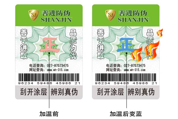 在防伪检测方面最为简单、最易操作的纳米级材料防伪;鉴别时只需标识上温度达到(如:打火机考图案部位),图案即消失或变色,温度恢复后,图案自然恢复,具有可逆性,是国内先进的防伪技术。