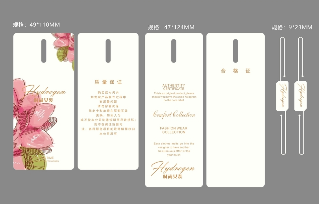 另外,近年还出现了用全息防伪材料制成的新型吊牌。再从它的造型上看,则更是印刷多种多样的:有长条形的,对折形的,圆形的,三角形的,插袋式的以及其它特殊造型的,真是多姿多彩,琳琅满目。 服装防伪吊牌的设计,印刷往往都是很精美的,而且内涵也是很广泛的。
